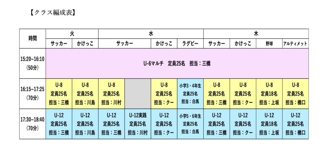 ・U6 全ての曜日 15:20~16:10 の時間で実施します。※下記詳細もご確認ください。